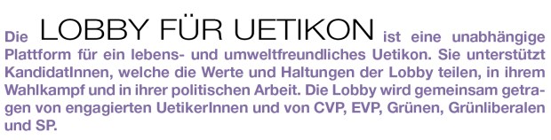 Die LOBBY FÜR UETIKON ist keine Partei, denn davon gibt es schon genug. Sie versteht sich vielmehr als gemeinsame Plattform von UetikerInnen, die sich aktiv für ein lebens- und umweltfreundliches Uetikon einsetzen wollen. Sie will sich als Lobby stark machen für eine Gemeinde mit hoher Lebensqualität, attraktiven Arbeitsplätzen und einem regen Dorfleben. Sie wird auch über die Wahlen hinaus mit ihren Aktivitäten für frischen Wind sorgen.