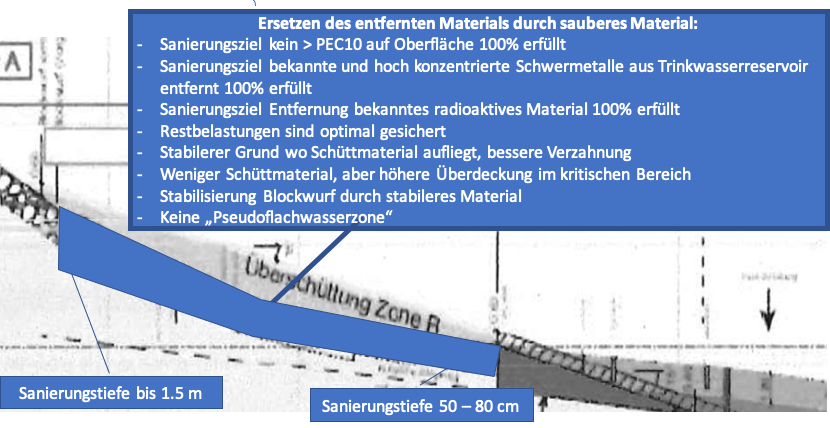 Die maximalen Belastungstiefen mit toxischen Schwermetallen liegen direkt neben dem Blockwurf. Sie liegen weit oberflächennäher, als die vermuteten 7 m Tiefe. Bereits im ursprünglichen Sanierungskonzept wäre nach Entfernung von 1.5 m Sediment hier eine lokale Schüttung vorgenommen worden. Während diese hauptsächlich aus Stabilitätsgründen geplant war, würde sie auch das Freisetzungspotential der darunterliegenden tieferen Restbelastungen reduzieren.