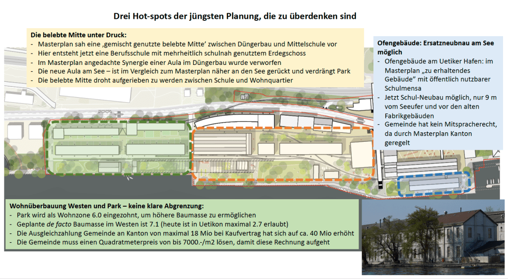 Das alte Ofengebäude direkt an der Seefront am Uetiker Hafen soll wie im Masterplan als ‚zu erhaltendes Gebäude’ eingezeichnet werden. Ein einseitig vom Kanton verfügbarer Neubau an dieser empfindlichen und für Uetikon so wichtigen Lage ist für die Gemeinde nicht akzeptierbar.